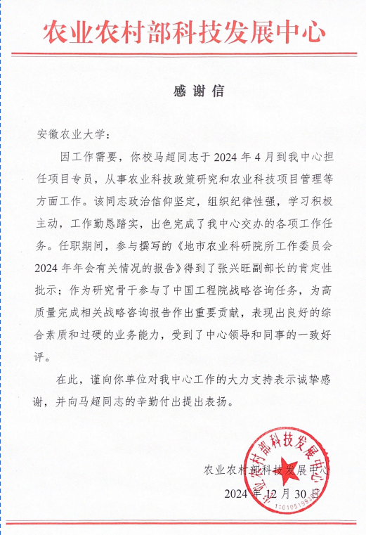 本网讯 近日,我校收到农业农村部科技发展中心的感谢信,对我校派出人员马超同志的工作予以充分肯定和赞扬。马超同志于2024年4月借调至农业农村部科技发展中心担任项目专员,从事农业科技政策研究和农业科技项目管理等工作。该同志政治信仰坚定,组织纪律性强,学习积极主动,工作勤恳踏实,出色完成了中心交办的各项工作任务。此封感谢信也是对我校科技管理服务工作的肯定,希望全体借调科技人员再接再厉,共创佳绩。感谢信内容如下: