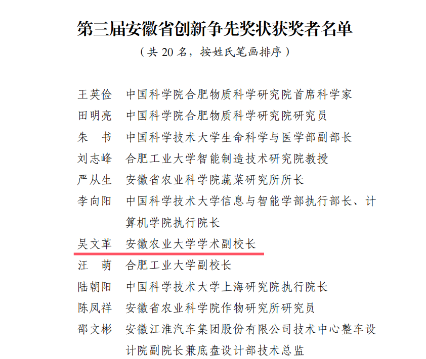 本网讯 近日,安徽省人力资源和社会保障厅、安徽省科学技术协会、安徽省科学技术厅、安徽省人民政府国有资产监督管理委员会联合发布关于表彰第三届安徽省创新争先奖获奖者的决定,我校学术副校长吴文革教授荣获“第三届安徽省创新争先奖状”。