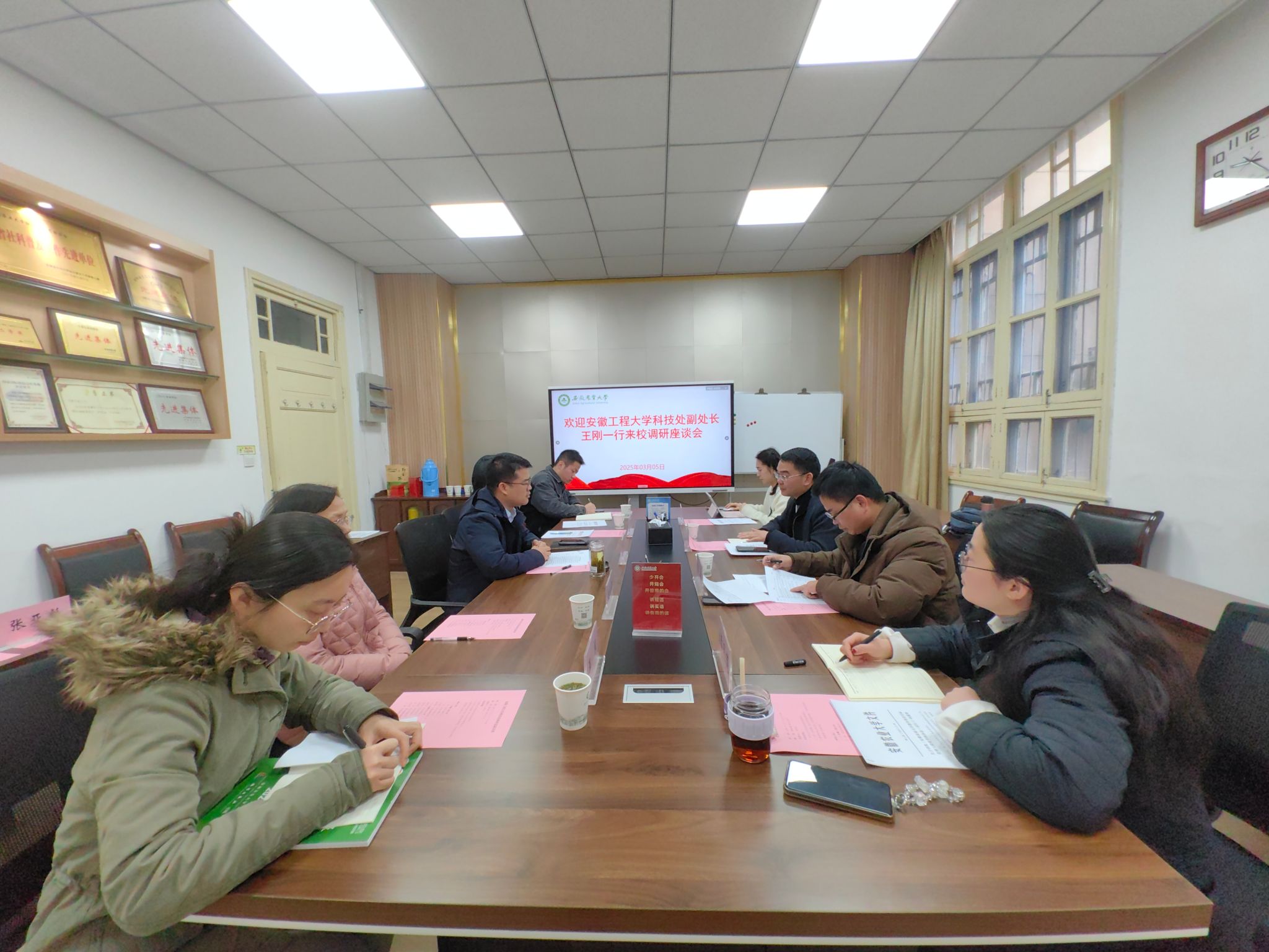 本网讯 3月5日上午,安徽工程大学科技处副处长王刚一行来校调研,科技处副处长凌英会主持座谈会。凌英会对王刚一行的到来表示热烈欢迎,并介绍了我校近些年科技创新特色做法及成效。王刚介绍了安徽工程大学科技管理经验做法。双方就国家基金申报、科研绩效考核、科技成果奖励、科研平台建设、高水平论文培育以及学报管理等工作进行深入交流。科技处全体工作人员参加了座谈会。(文/编辑 张亚彪 图/王友煜 预审/凌英会 审核/王晓波)