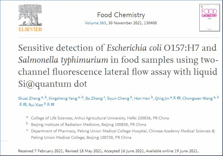 针对食源菌构建的超敏荧光免疫层析技术可以快速、准确筛查细菌污染的多种食品,灵敏度比现有商业化试剂提高约200倍。相关内容发表在中科院一区杂志《Food Chemistry》(TOP期刊,影响因子7.5)上,我校博士研究生郑帅为第一作者,汪崇文副教授,金青教授及军事医学科学院肖瑞副研究员为通讯作者,本校为第一单位。全文链接:
