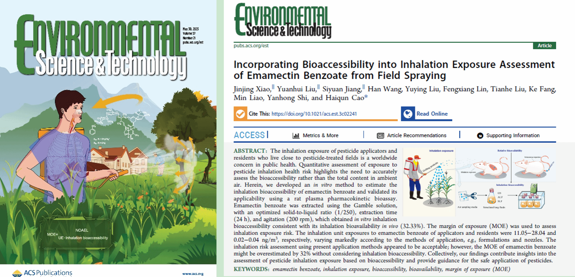 本网讯 近日,我校植物保护学院操海群教授团队在环境科学领域顶级期刊《Environmental Science & Technology》(IF=11.357)上发表了题为“Incorporating bioaccessibility into inhalation exposure assessment of emamectin benzoate from field spraying”的封面文章。