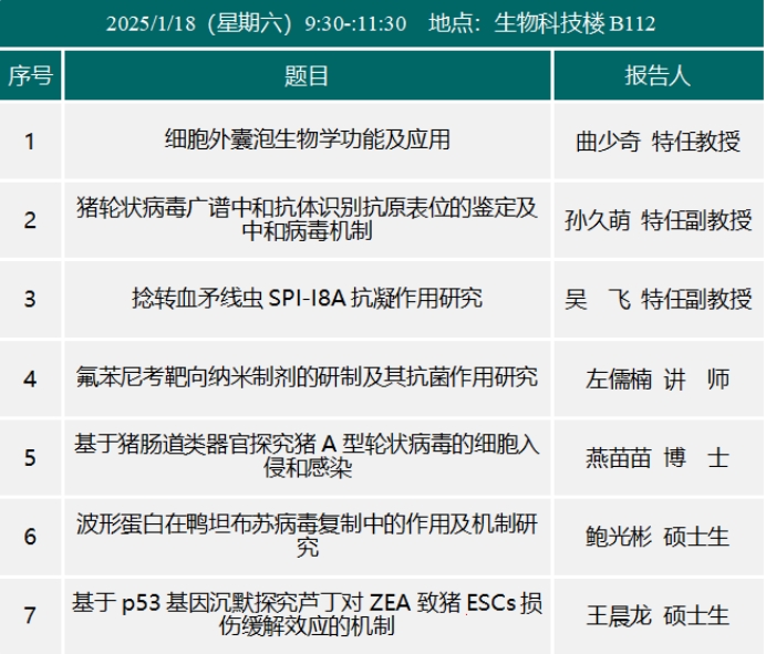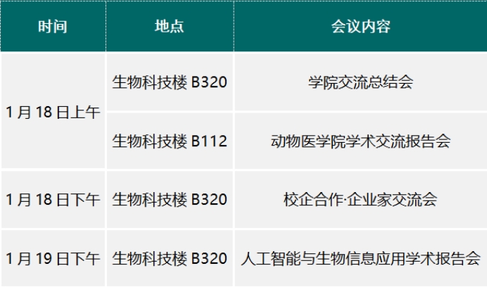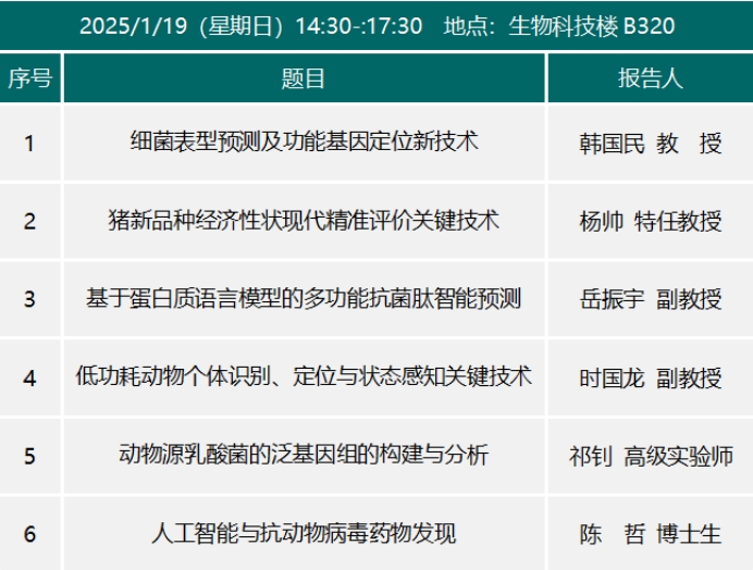 会议时间:2025年1月18-19日会议地点:生物科技楼B320、B112主办单位:动物医学院、科技处、兽医病理生物学与疫病防控安徽省重点实验室、安徽省动物性食品质量与生物安全工程实验室会议议程安排省级重点实验室学术报告会议程人工智能与生物信息应用学术报告议程