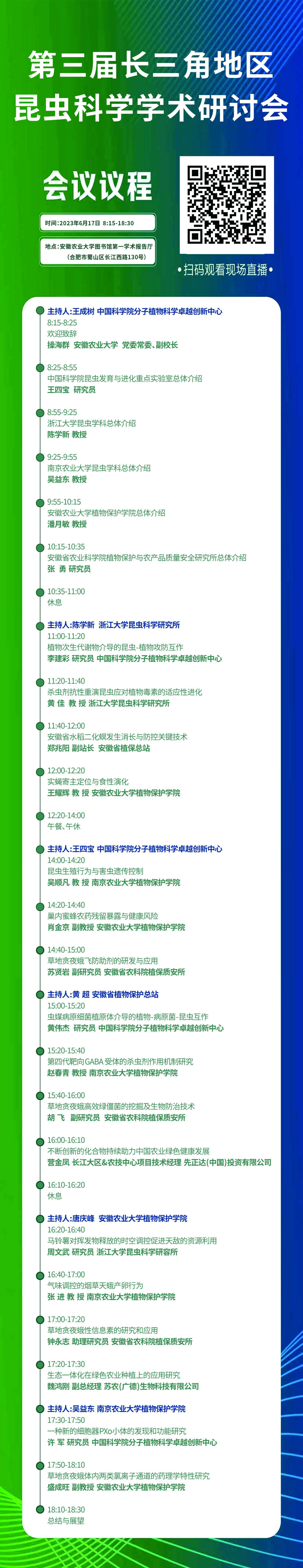 为加强长三角地区昆虫学同行学者之间的交流与合作,展示最新科研成果,促进长三角地区昆虫学基础和应用研究,兹定于2023年6月17日在安徽农业大学图书馆第一学术报告厅召开“第三届长三角地区昆虫科学学术研讨会”。本次研讨由安徽农业大学植物保护学院、安徽省植物保护总站、安徽省农业科学院植保质安所、安徽省昆虫学会主办。