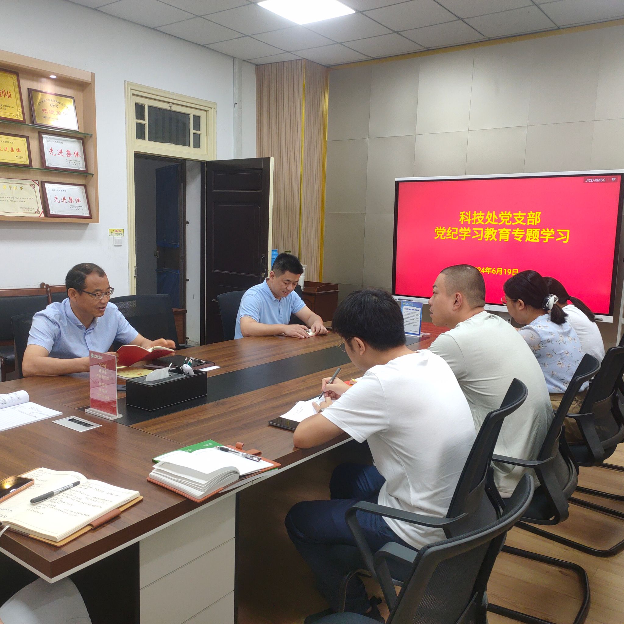 6月19日上午,科技处党支部在108会议室,组织开展党纪主题教育学习研讨,会议由支部副书记主持。会议集中学习了《中国共产党纪律处分条例》中政治纪律、组织纪律、廉洁纪律、群众纪律、工作纪律、生活纪律内容。会议强调全体党员要原原本本学习《条例》内容,牢固树立底线意识、增强纪律观念;要将纪律学习内化于心、学有所用,切实增强党性修养,提振干事创业的精气神。会上还通报了警示典型案例,要求全体党员干部要引以为戒、保持警惕、不碰红线,始终做到忠诚干净担当。(文/张亚彪 图/王雁 编辑/张亚彪 审核/叶辉)