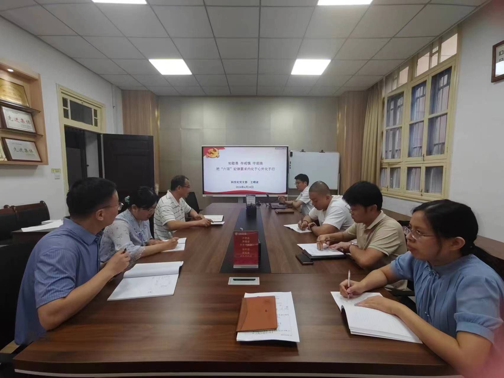 6月24日上午,科技处党支部在108会议室组织开展党纪学习交流暨支部书记上党课活动,会议由支部书记王晓波主持。王晓波以《知敬畏、存戒惧、守底线,把“六项”纪律要求内化于心外化于行》为题,分享了《中国共产党纪律处分条例》形成发展脉络、条例修订的意义以及学习条例需要把握的主旨要义等内容,结合案例重点解读了有关“学术称号”、“违规经商”等条款,号召全体党员要立足岗位本职工作,增强干事创业动力、增强遵规守纪自觉、增强斗争本领。支部党员就近阶段学习心得做了交流。(文/张亚彪 图/赵羽 编辑/叶辉 审核/王晓波)