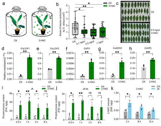 虫害是影响茶树产量和品质的重要生物胁迫因素之一。乙酸叶醇酯(3-HAC)、β-罗勒烯、吲哚等在内的挥发性物质是茶树响应茶尺蠖等害虫取食后产生的重要次生代谢物,具有吸引害虫天敌和诱导激活植物产生抗虫防御反应的作用。然而,3-HAC作为茶树中主要的挥发性物质,是否参与茶树被茶尺蠖取食诱导的防御反应及其生物合成与调控机制尚不清楚。