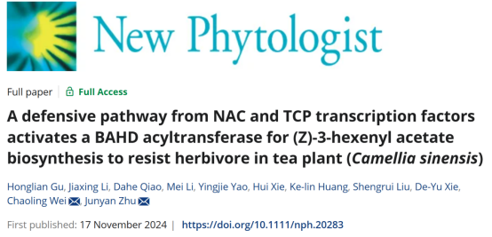 本网讯 11月17日,我校茶树生物学与资源利用国家重点实验室韦朝领团队的青年教师朱俊彦等在《New Phytologist》期刊在线发表了题为“A defensive pathway from NAC and TCP transcription factors activates a BAHD acyltransferase for (Z)-3-hexenyl acetate biosynthesis to resist herbivore in tea plant (Camellia sinensis)”的研究论文,该研究揭示了乙酸叶醇酯参与茶树抵御茶尺蠖取食的分子调控机制,为抗虫茶树品种选育与害虫绿色防控技术开发提供了重要候选基因和理论依据。