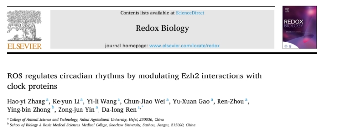 本网讯 近日,我校动物科技学院任大龙、殷宗俊教授课题组在生物学领域权威期刊《Redox Biology》(影响因子11.4,中科院一区TOP期刊)发表题为“ROS regulates circadian rhythms by modulating Ezh2 interactions with clock proteins”的研究论文。该研究首次揭示了氧化应激通过修饰EZH2和钟蛋白相互作用调控生物节律的新机制,为相关疾病的干预治疗提供了重要理论依据。