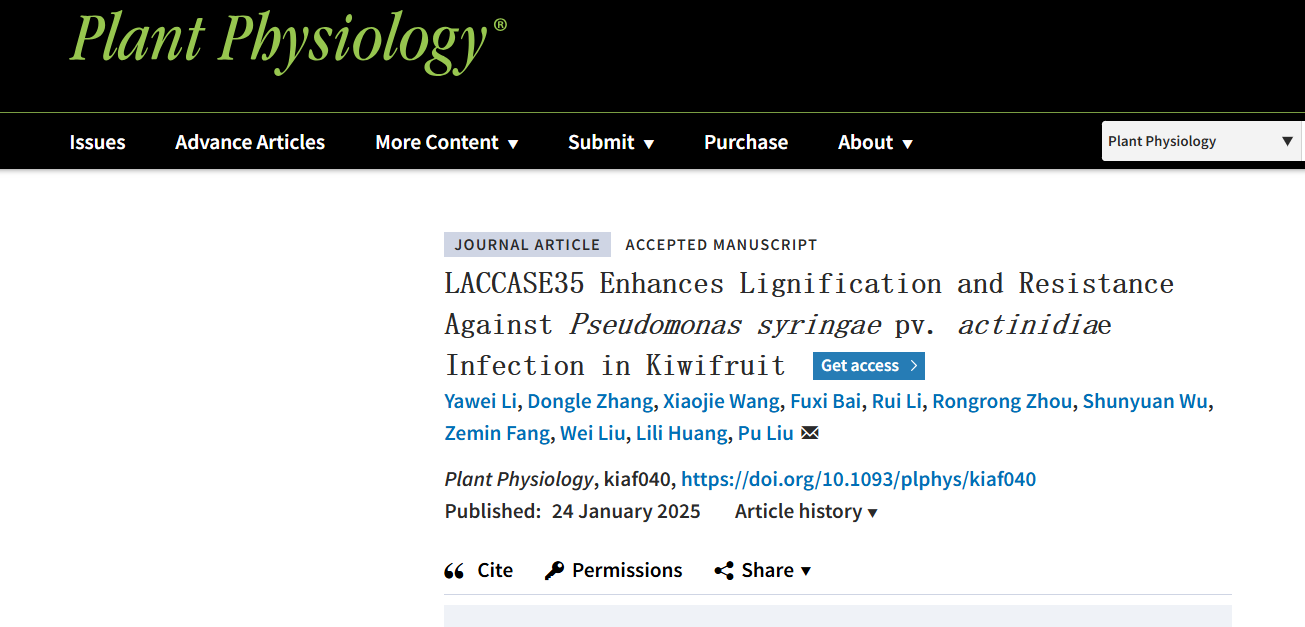近日,我校园艺学院果树抗病机制与种质创新团队在Plant Physiology在线发表了题为“LACCASE35 Enhances Lignification and Resistance Against Pseudomonas syringae pv. actinidiae Infection in Kiwifruit”的研究论文,揭示了漆酶基因AcLac35诱导猕猴桃细胞壁木质化增强了对溃疡病菌抗性的新发现。