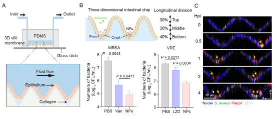 该研究综合微生物学、力学生物学、药剂学相关的多学科交叉研究手段,首次发现了病原菌感染呈现明显的“边际效应”,即位于几何限制单层边际的细胞更易被细菌感染,并据此提出了针对性的防控策略。基于对细菌空间特异性定殖模式的深入解析,研发了新型药物递送系统。在三维肠芯片模型中,发现细菌在隐窝结构中优先定殖。通过构建“核-壳”药物递送系统,将抗生素精准递送至肠道隐窝区域,显著降低细菌载量(图)。在建立的小鼠肠道耐万古霉素肠球菌感染模型中,药物递送系统显著提高了抗消化道细菌感染效果,实现了基础与应用研究的融通发展。这一范例不仅展示了基于组织几何结构的精准药物递送策略的可行性,还为进一步发展宿主导向抗菌策略和开拓合理用药新手段提供了重要参考。