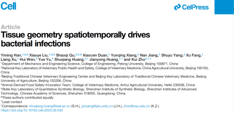 本网讯 4月21日,我校动物医学院曲少奇教授联合中国农业大学朱奎教授、北京大学黄建永研究员及中国科学院深圳先进技术研究院黄术强研究员,在世界顶级期刊《细胞》(Cell)发表了题为《组织几何结构驱动细菌感染的时空动态规律》(Tissue geometry spatiotemporally drives bacterial infections)的研究论文。该研究首次发现了细菌感染“边际效应”,阐明了力学微环境调节细菌感染的分子机制,构建了靶向细菌定殖的药物递送系统,发展了宿主导向抗菌策略,为应对细菌耐药性危机提供了新的思路。