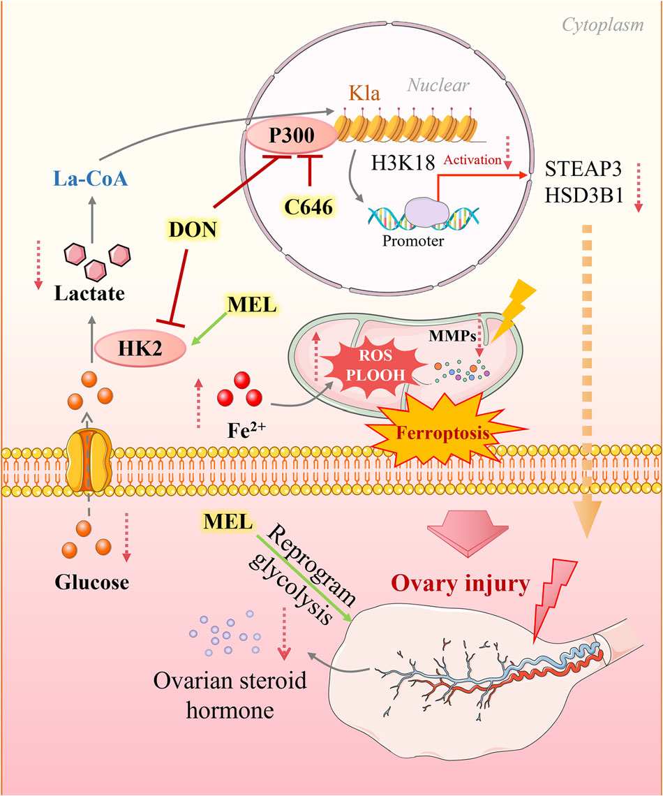 脱氧雪腐镰刀菌烯醇(DON)是污染畜禽饲料的主要真菌毒素之一,可通过诱发氧化应激对机体造成损伤,影响畜禽的消化、代谢及生殖功能。为揭示DON对卵巢功能损伤的分子机制,团队成功构建了DON处理的仔猪和鼠动物模型,实验发现DON会显著抑制卵巢颗粒细胞糖酵解过程,降低组蛋白乳酸化(H3K18la)修饰水平,进而抑制下游基因STEAP3的表达,导致细胞脂质过氧化和铁死亡。此外,褪黑素作为一种内源性抗氧化剂,成本低、安全性高,其通过增强糖酵解、提高乳酸和H3K18la水平,恢复STEAP3表达,抑制铁死亡,最终改善DON引起的卵巢损伤和生殖功能下降。
