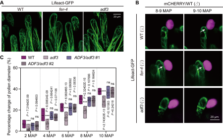 该研究发现FER的功能缺失会导致柱头乳突细胞中微丝骨架结构异常,并且其突变体柱头细胞中微丝在授粉后向花粉附着点重塑聚集的速率显著加快(图1A-B)。利用IP-MS和蛋白互作验证,该研究发现FER能够通过其胞内结构域与微丝解聚蛋白(Actin Depolymerizing Factor,ADF)ADF3发生相互作用。ADF3的功能缺失同样能够造成柱头细胞中微丝骨架结构异常,其突变体柱头细胞微丝在授粉后向花粉附着点重塑聚集的速率出现显著减慢的现象,导致花粉水合速率明显下降(图1A-C)。