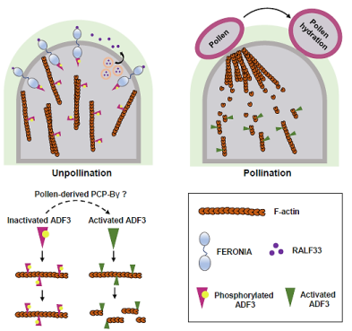 该研究进一步利用体内和体外磷酸化实验以及质谱分析发现,FER能够通过识别RALF33小肽信号介导ADF3第52和94位苏氨酸的磷酸化修饰,借此抑制ADF3与微丝之间的亲和力,导致ADF3的微丝解聚功能受抑,干扰柱头微丝在授粉后向花粉附着点的重塑聚集,抑制柱头细胞向花粉供水(图2)。此外,该研究还发现花粉小肽PCP-Bγ可以依赖ADF3促进柱头微丝在授粉后向花粉附着点的重塑聚集,以便花粉水合(图2)。