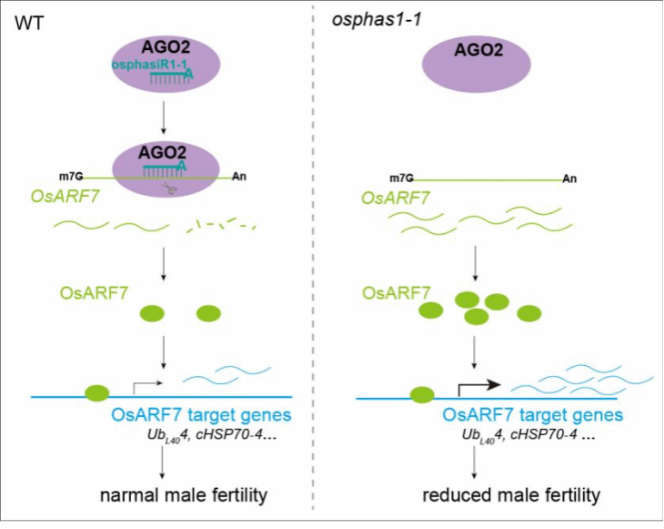 该工作不仅回答了领域内关于“单个phasiRNA是否有功能”的长期疑惑,还揭示了osphasiRNA-OsAGO2-OsARF7的水稻雄性育性调控新分子通路,拓展了人们对phasiRNA功能机制的认知,为作物遗传改良和杂交育种提供了理论依据和潜在靶点。