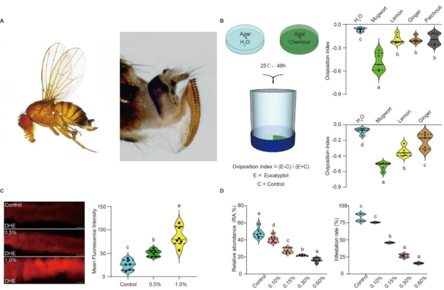 新型植物源驱/杀虫剂具有低毒、高效和无残留特点,符合绿色农业的发展要求,是近年来研发的新动向之一。本研究利用产卵二选择装置筛选了多种药用植物,最终发现艾叶(Artemisia argyi)能够高效地驱避斑翅果蝇产卵(图B),并进一步解析出驱避有效成分为桉叶油醇。随后,利用遗传学、免疫学、分子生物学等技术,揭示桉叶油醇激活斑翅果蝇嗅觉系统,并导致活性氧(ROS)在肠道中积累,增加氧化应激,进而引起害虫死亡(图C)。最后,开展田间测试,结果表明艾叶精油高效地驱避斑翅果蝇在葡萄上产卵,降低坏果率,显著地提高了葡萄园田间防控效果(图D)。本研究成果为进一步阐明斑翅果蝇的防治提供了重要理论基础,也为科学管控斑翅果蝇提供了参考和借鉴。