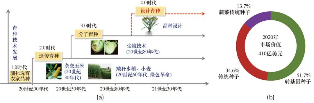 ▲ 育种技术发展历程(a);全球商品化种子2020 年市场价值份额(b),数据来源:AgbioInvestor 公司2020 年数据