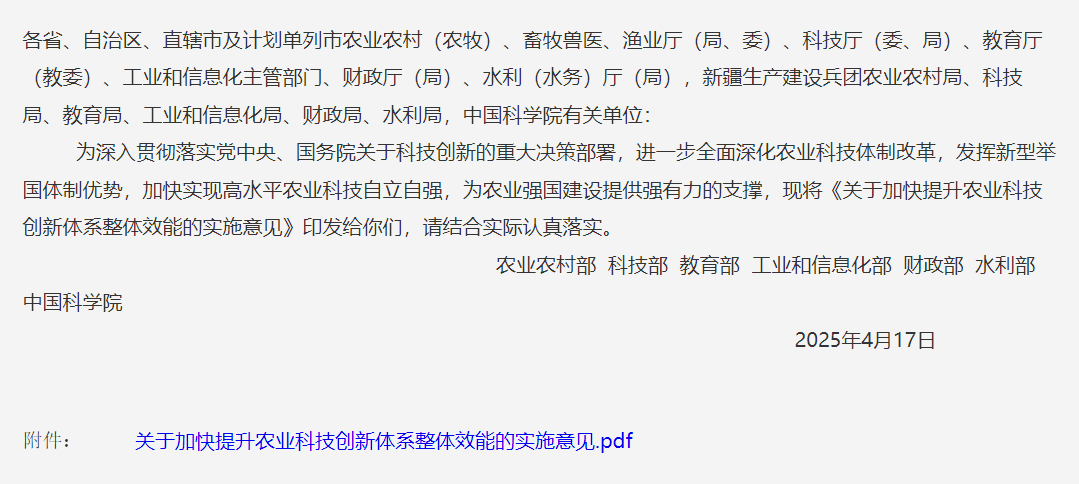 关于加快提升农业科技创新体系整体效能的实施意见