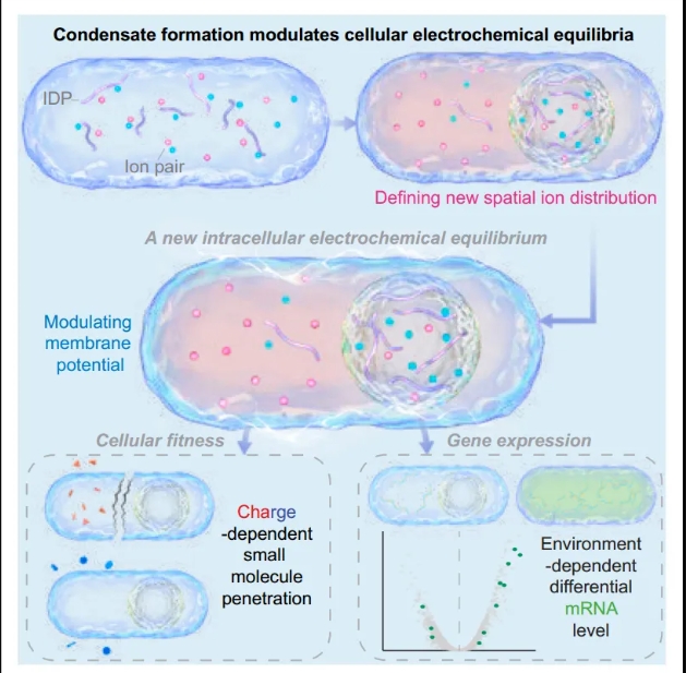 该研究发现生物分子凝聚体的形成可以调节细菌细胞中的电化学环境,从而影响细胞的整体过程。凝聚体的形成会产生电位梯度,直接影响细胞的电化学性质,包括细胞质pH和膜电位。由于被动的环境影响,凝聚体的形成也放大了细胞-细胞电化学特性的可变性。电化学平衡的调节进一步控制细胞-环境相互作用,从而直接影响细菌在抗生素胁迫下的生存。凝聚体介导的细胞内电化学平衡的转移驱动了全局基因表达谱的变化。该研究揭示了凝聚体的生化功能,这些功能超出了生物分子驱动和参与凝聚体形成的功能,揭示了凝聚体在调节全球局细胞生理中的作用。